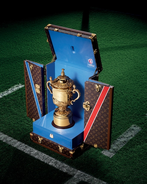 After an initial partnership in 2015, Louis Vuitton is once again the Official Trophy Trunk Supplier of Rugby World Cup France 2023 with a bespoke trunk for the coveted Webb Ellis Cup. Marking a new chapter in Louis Vuitton’s long-standing relationship with the Rugby World Cup, the hand-crafted trunk features the iconic Monogram canvas in the tournament’s colors, as well as the Roman numerals XV representing the number of players in a rugby union team and a Louis Vuitton leather lining in the same Pantone blue as the painted V detail, a first in the Maison’s history of trophy trunks.