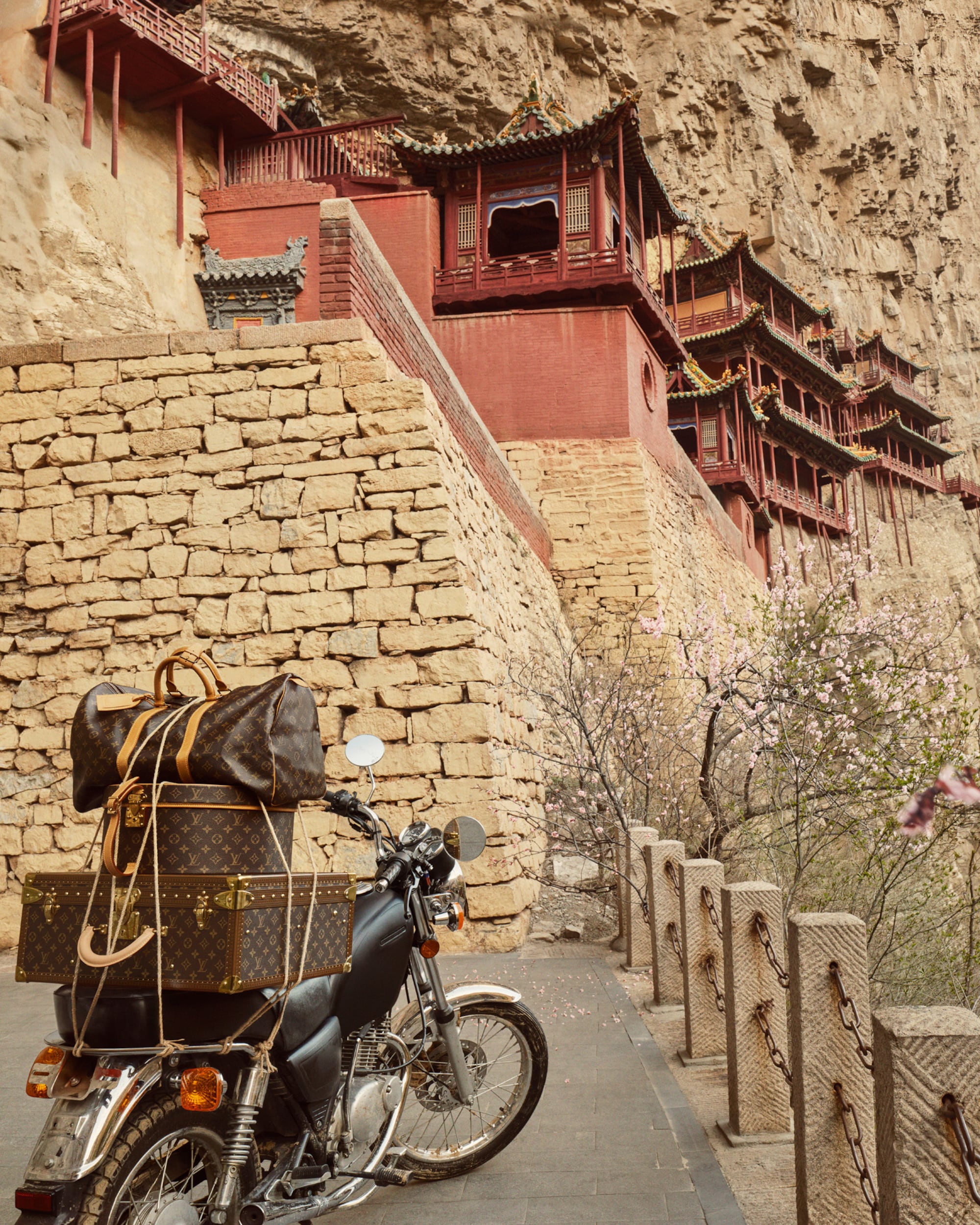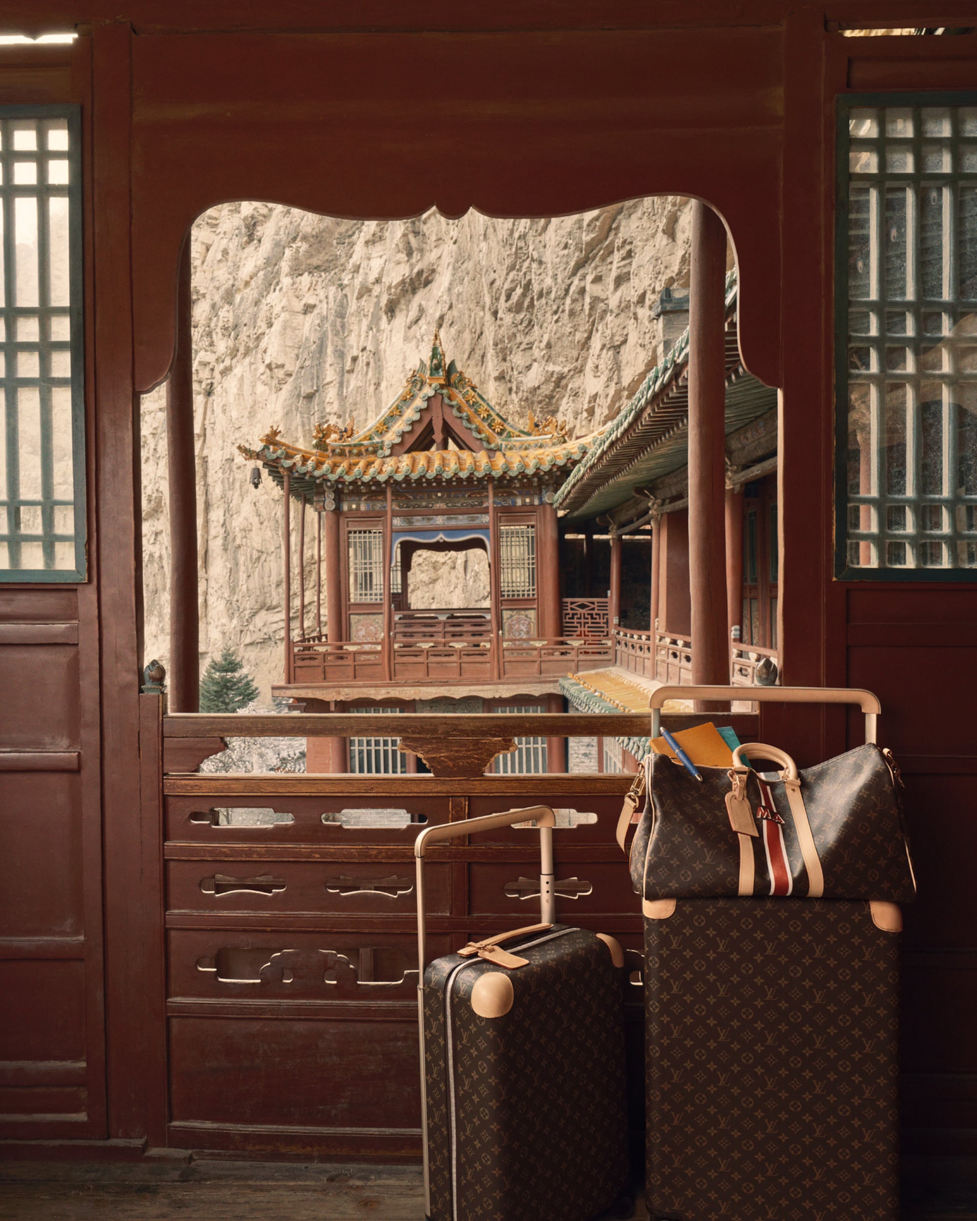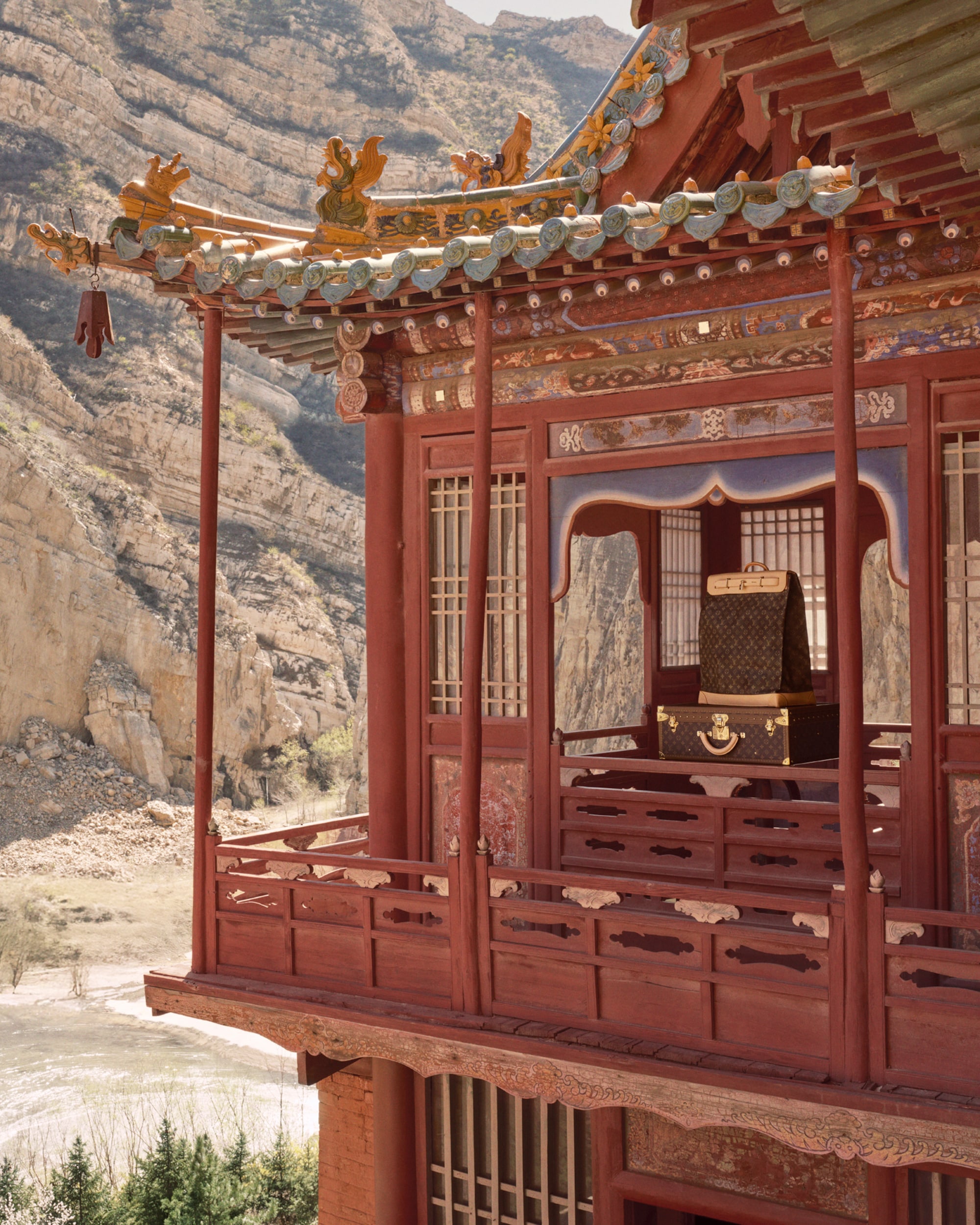 Journeying eastward, the House presents its iconic Speedy and Steamer bags within the unique architecture of the Xuankong Hanging Temple in Datong — a tribute to timeless craftsmanship perched against the cliffside.