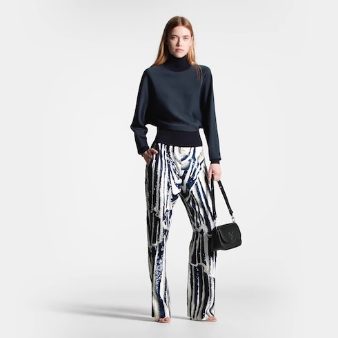 These pants make a sophisticated statement in intricate allover sequin embroidery in a graphic abstract animal motif that celebrates the House’s savoir-faire. Crafted in an elegant boot-cut silhouette with a contrasting satin waistband for a refined finish. Complete with practical side and back pockets and a discreet invisible zipper fastening for a streamlined look.