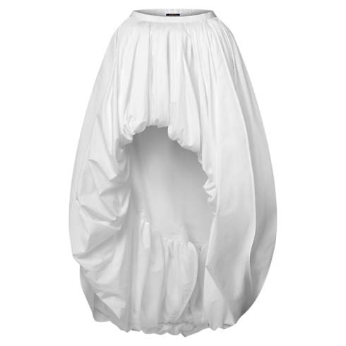 Epitomising on the extravagance of the runway collection, this statement skirt swaddles the silhouette in a voluminous balloon shape with a dramatic asymmetrical hemline that grazes mid-thigh at the front and falls to the ankle at the back. It is crafted from lightweight, airy cotton poplin and discreetly fastened at the side with a button and zipper.