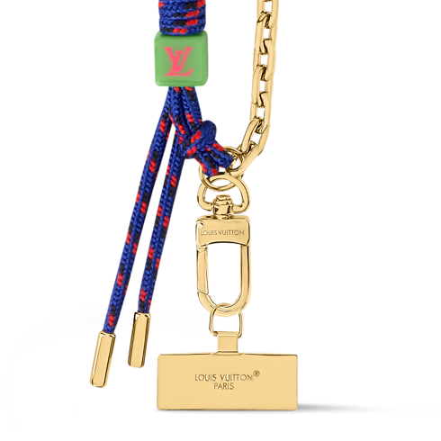 The sporty-chic Braided phone strap combines on-trend elegance with practical utility. A colorful braided textile cord is paired with a gold-toned chain and a Louis Vuitton Paris tether tab. Long enough to wear cross-body, this versatile strap is perfect for keeping a phone close at hand while adding a stylish accent to any look.