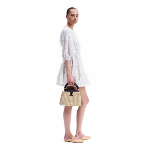 This Capucines BB is handwoven from rattan, with each one-of-a-kind design taking two days to complete. Lending a resort-inspired aesthetic, it is evocative of the House’s Picnic Trunk from 1892 and opens to reveal a patterned lining. It can be worn with the flap styled inside or out, and is sized to fit everyday essentials. The signature LV Initials add the final flourish.