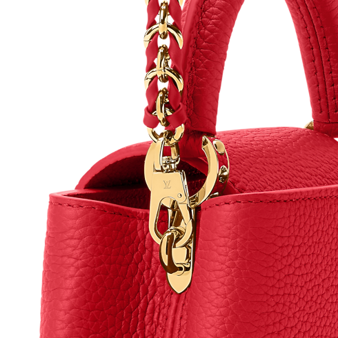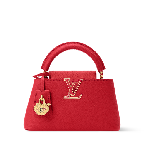 This Capucines East-West Mini celebrates the Lunar New Year with a vibrant Sari Red palette. Crafted from Taurillon leather, it is trimmed with cowhide and adorned with tonal LV Initials. The double-carry style includes a removable braided strap for cross-body wear and features a playful charm to mark the Chinese holiday.