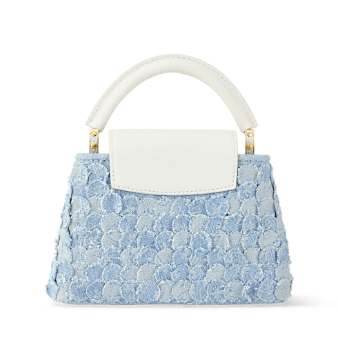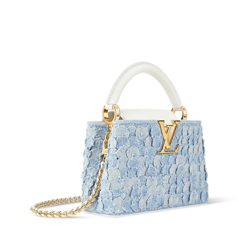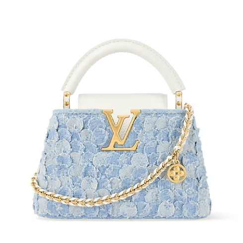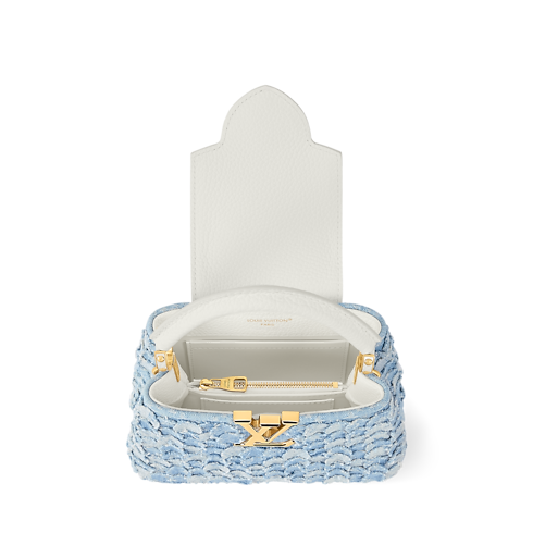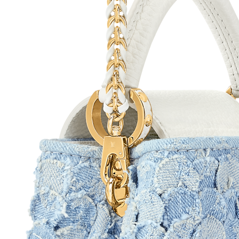 This unique edition of the Capucines Mini belongs to the Denim Rendez-Vous collection. Defined by its patchwork design, this elegant handbag is trimmed with contrasting white Taurillon leather along the handle and flap. It is adorned with signature LV Initials in a gold-toned finish, which matches the charm-embellished braided chain. Inside, there is just enough space for the essentials, including a compact wallet.