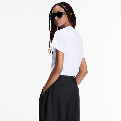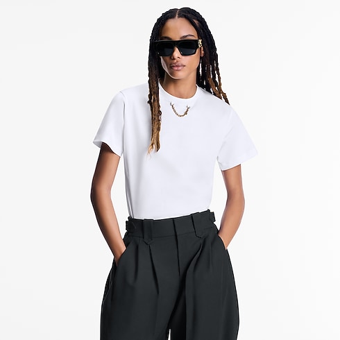 An enduring staple elevated with a subtle Louis Vuitton twist. This essential crisp white T-shirt is crafted from soft, breathable cotton jersey in a classic fit for comfortable everyday wear. A brass LV Circle chain detail adds a chic contemporary signature to the crew neckline. Fresh and versatile.