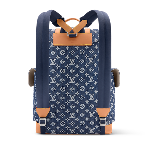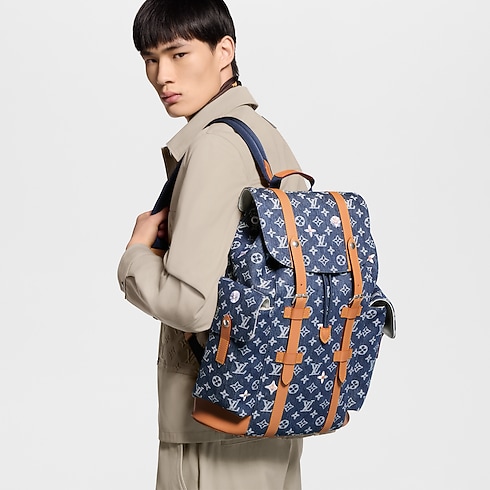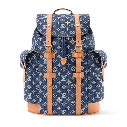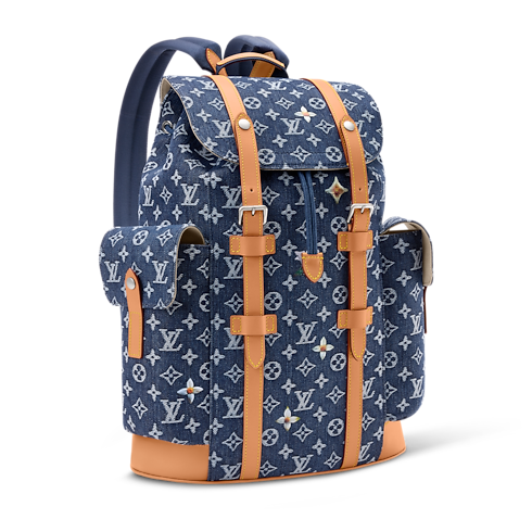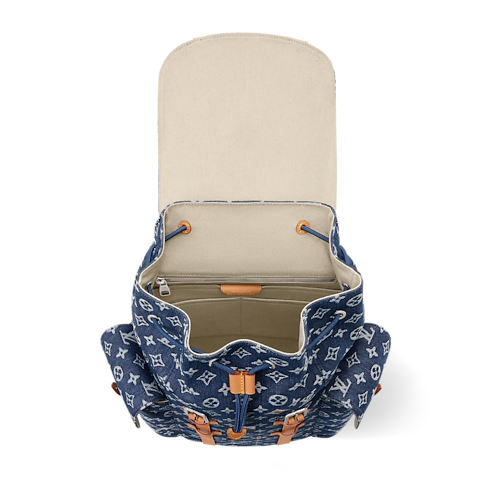 The Christopher MM backpack’s rugged silhouette is crafted from Monogram Flowers Denim, a jacquard fabric where the Monogram motif is woven directly into denim for a textured two-tone effect in white and indigo. Cowhide-leather trim and two side pockets underscore its bold lines, while an ecru textile lining completes the design.