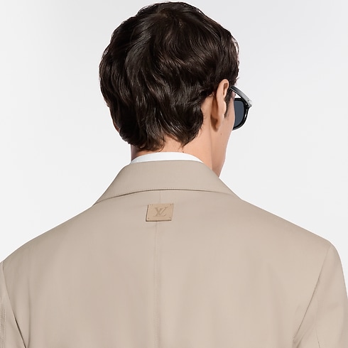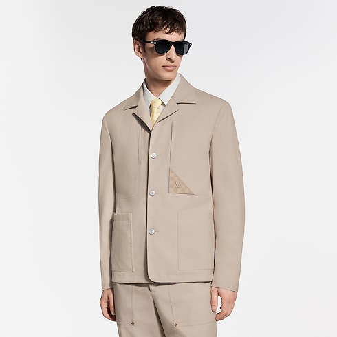 This minimalist beige workwear jacket makes an elegant modern addition to the formal wardrobe. It is tailored from a smooth cotton-silk canvas that is light and breathable for summer. A tone-on-tone triangular leather patch adorns the left chest, crafted with a Damier motif and embellished with a metal LV ornament. Matching pants make an effortless set.