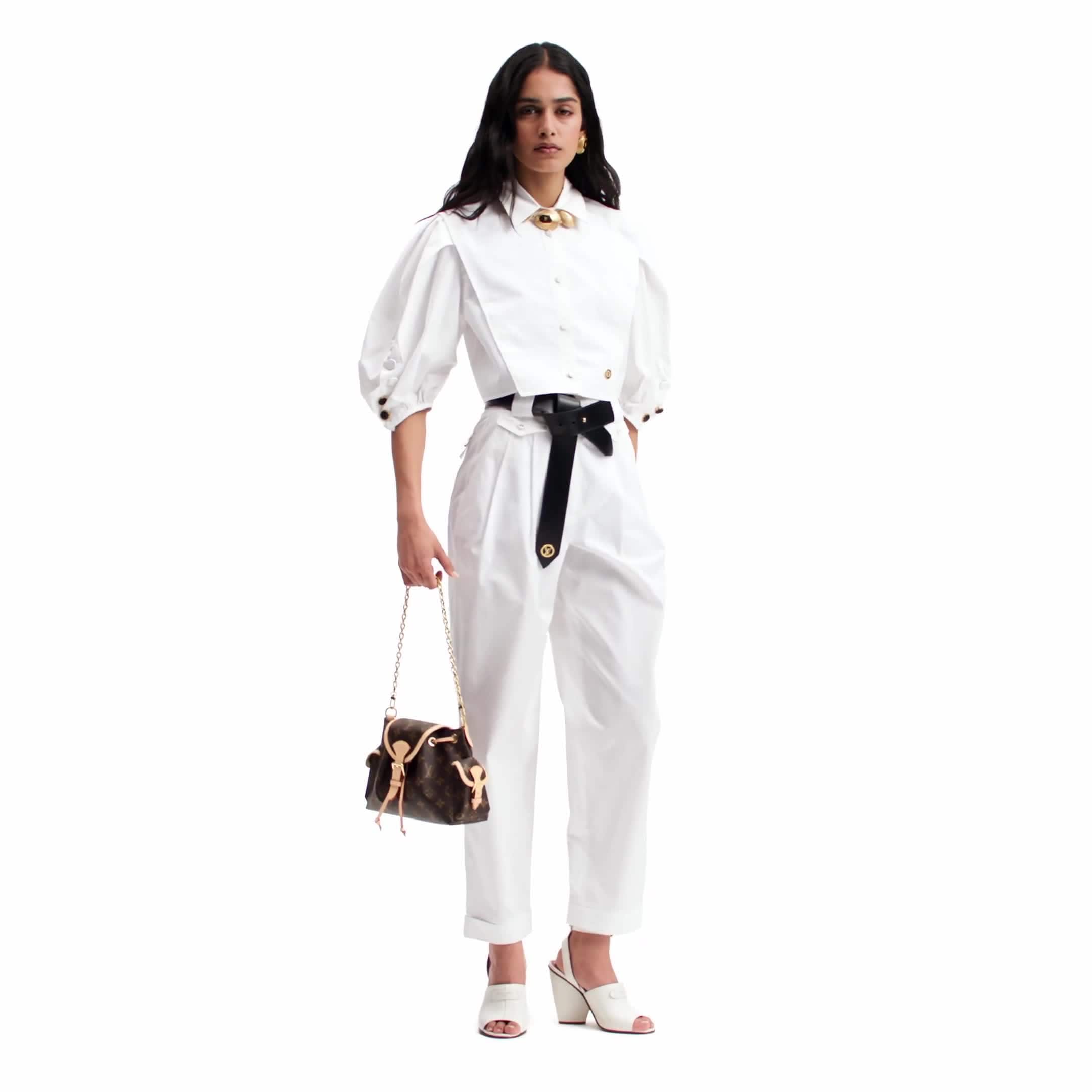 These pants have fresh summer appeal in crisp cotton poplin cut in a voluminous wide-leg shape, which is emphasized with pleats at the hips. A chunky high-rise waistband flatters the figure, while two mini flap pockets add a structured touch and this season’s elegant gold-trimmed embroidered button elevates the fastening with a refined finish.