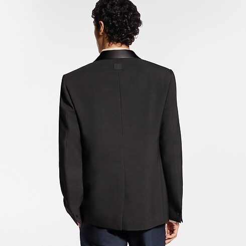 Minimalist lines accentuate the impeccable elegance of this double-breasted tuxedo jacket, tailored from black wool-silk crepe with a satin shawl lapel. A single jewel-like signature button adorns the fastening while pick stitching adds a classic sartorial detail. Finishing touches include a woven LV label on the back and LV Blason lining. Matching pants make a chic evening set.