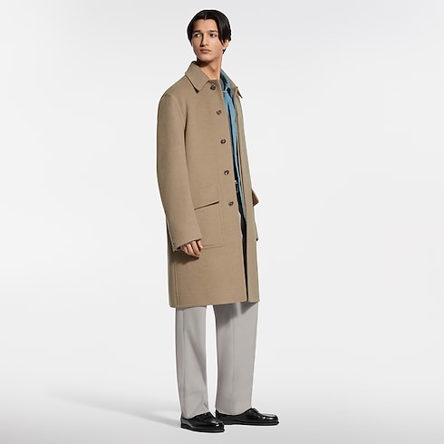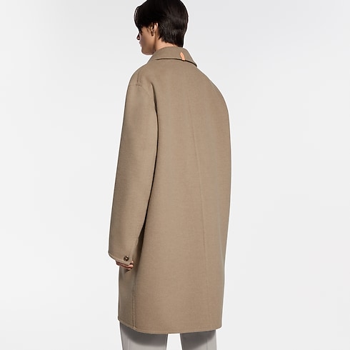 This timeless caramel colored car coat is crafted from brushed cashmere double-face fabric for unparalleled softness and warmth. The unlined silhouette makes a fluid, effortlessly elegant outer layer. It is signed with LV stitching on the top button and a VVN leather tab on the back of the collar, while pick stitching adds a sartorial finishing touch.