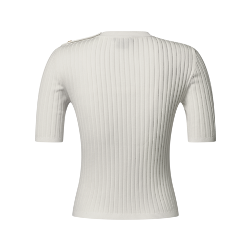 This short-sleeved knit top is elegant and versatile in a form-fitting ribbed knit spun from a refined wool-silk blend. The left shoulder is highlighted with three golden LV buttons for an understated uniform feel as part of the Nautical collection’s elevated approach to maritime codes.