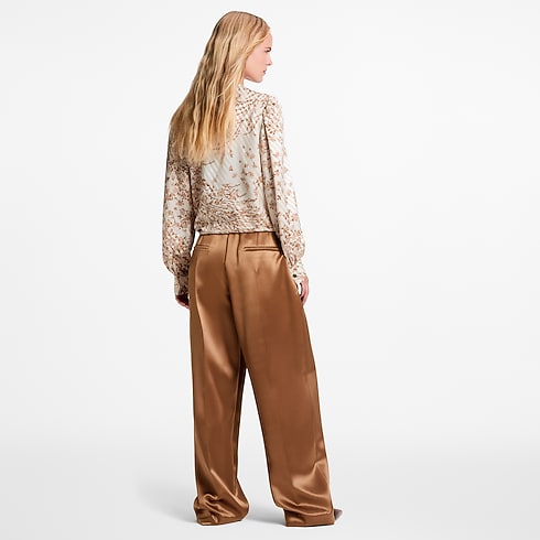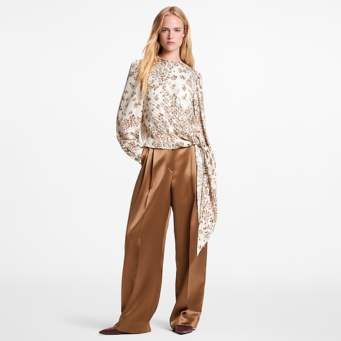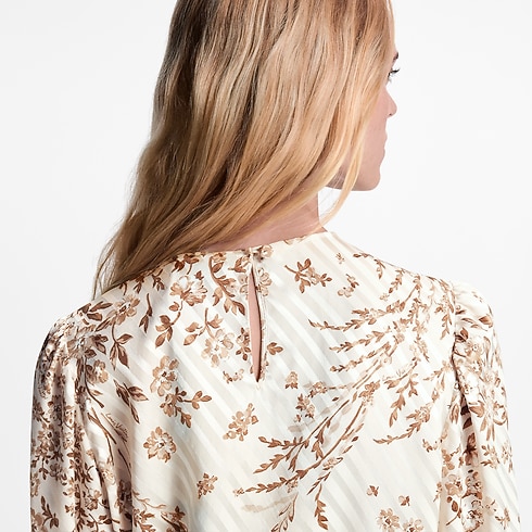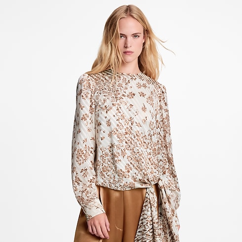 This blouse has a chic, modern look in airy silk twill featuring a romantic jacquard of stripes and flowers. The long sleeves are gathered around the shoulders to emphasize the fluidity, while the left hip is finished with a breezy knotted tie that gracefully drapes to the side. Fastened at the back with an elegant keyhole neckline.