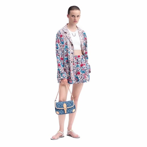 The House’s classic pajama shirt is vibrantly uplifted with this season’s romantic floral vine motif on fluid silk crepe de chine, while a signature Monogram bloom print introduces a subtle contrasting accent to the front and back. Contrasting piping adds a classic loungewear touch to the notched collar, patch pockets and cuffs.