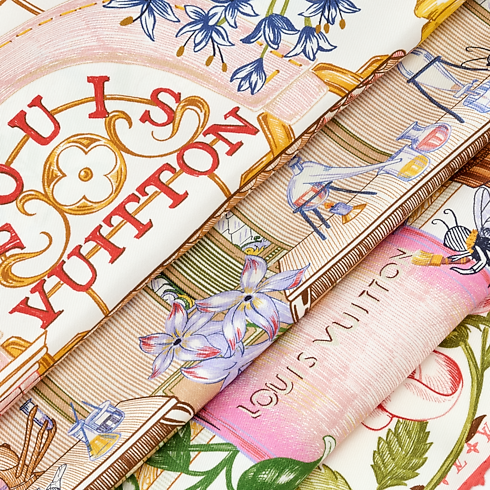 The all-silk Fontaines Parfumées square captures the essence of Louis Vuitton in an intricate design inspired by the art of fragrance. Its colorful pattern depicts a vintage-style perfume extractor surrounded by delicate flowers, with the House’s perfumery atelier in the background. An elegant, feminine accessory, infused with the harmony of craftsmanship and nature.