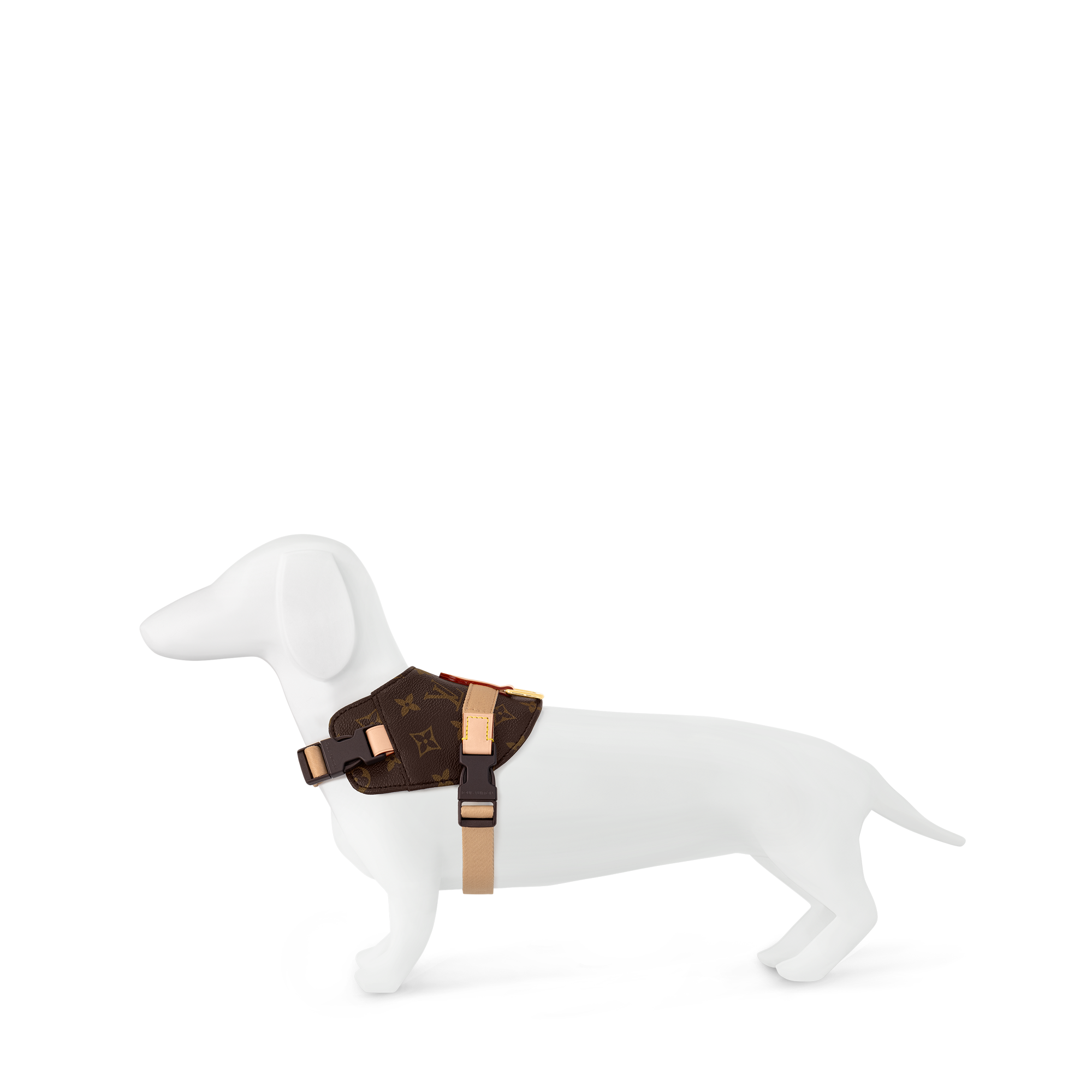 A good-looking accessory for morning and afternoon walks with the dog, the Harness is clad in Monogram canvas and natural cowhide leather with adjustable webbing featuring LOUIS VUITTON. The indispensable accessory comfortably adjusts to the shape of the dog, and the harness securely clips onto the matching dog leash.