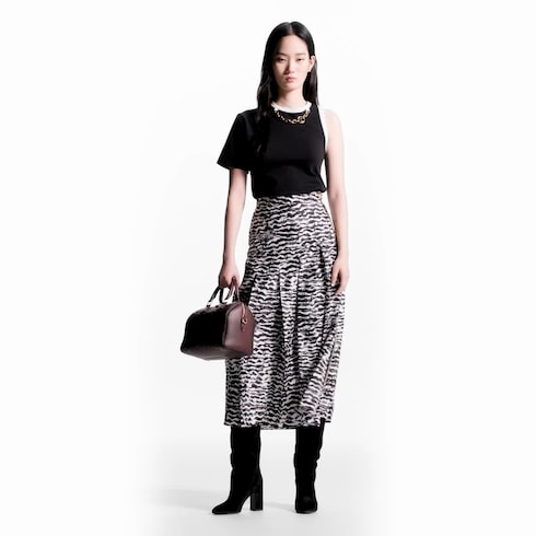 This season’s signature ink tiger motif reworks the House’s go-to midi skirt with a contemporary graphic look. The breezy silhouette is finished with asymmetrical pleats that emphasize the fluidity of the soft silk twill, while an exposed brass double zipper adds a versatile detail to the left side.