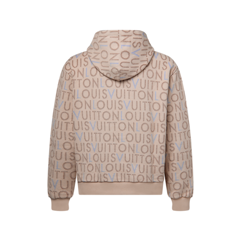This graphic cotton hoodie is elevated with the Spring-Summer 2026 show’s LV Maze motif, inspired by hand-painted billboards in India. It features pale brown and blue Louis Vuitton lettering all over, which is integrated into the cream-colored jersey knit with a softly stippled effect. This piece brings a modern signature accent to casual silhouettes.