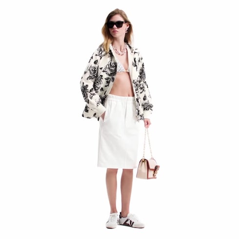 This skirt playfully borrows from menswear codes with an elasticated waistline trimmed with two mini buttons and a faux fly. It is cut from casual cotton jersey in an unfussy knee-length shape for versatile daily styling. A tone-on-tone embossed Monogram denim pocket signed with a golden Louis Vuitton plaque adds a signature touch to the back.