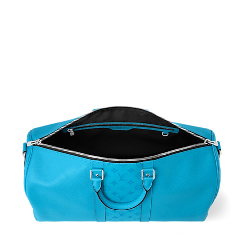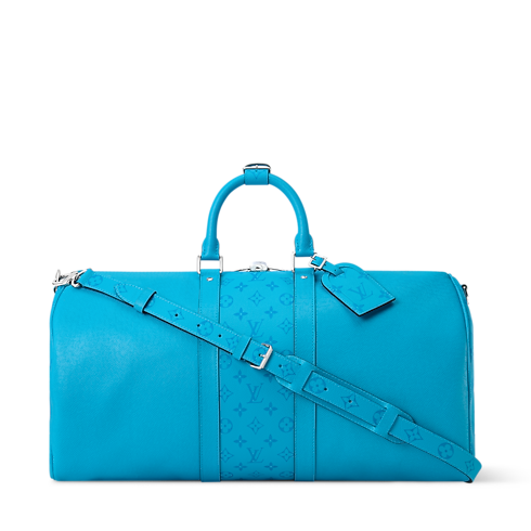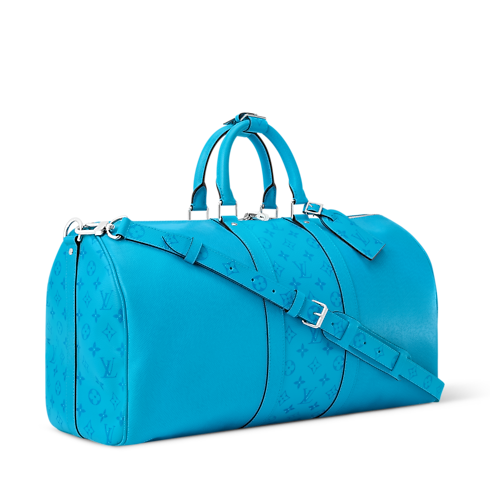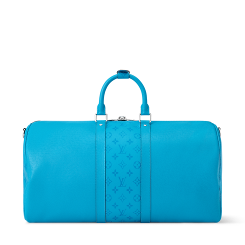 A combination of Taiga leather and matching-colored Monogram canvas brings a summery feel to this Keepall Bandoulière 50. The Monogram pattern also appears on the name tag and removable strap. Two top handles, along with the strap, offer versatile carry options. This cabin-sized Keepall makes an ideal weekend bag.