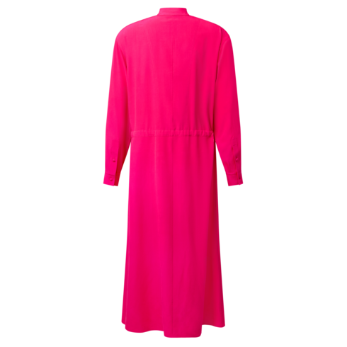 This dress is bright and breezy in silk crepe de chine in an eye-catching seasonal shade. It is cut in a long-sleeved, full-length silhouette with a drawstring waistline for added definition. It has a subtly sporty spirit thanks to golden snap buttons on the standing collar and two side pockets, as well as an exposed zipper fastening.