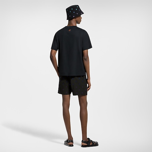 The chic black silhouette of these eye-catching swim shorts is elevated with embroidered LV Blason signatures allover, whose vibrant colors create a sophisticated gradient effect. They are tailored from technical fabric with side splits and a drawstring waist. LV-engraved cord ends with a gunmetal finish add a smart finishing touch.