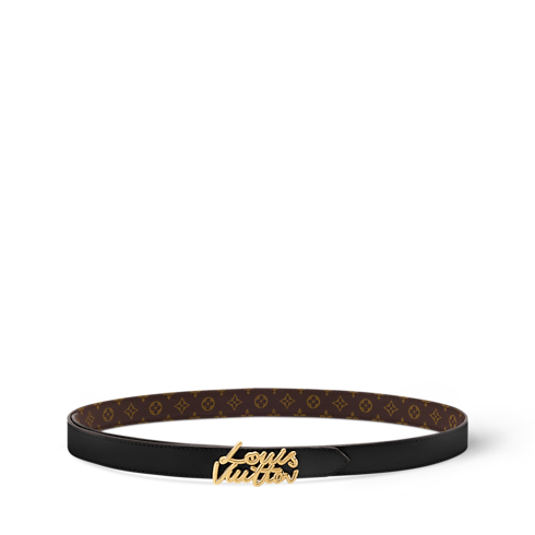 The reversible design of the LV Script belt offers a choice of sumptuous calfskin or the House’s iconic Monogram canvas. Its centerpiece is an outsized buckle crafted in gleaming gold-colored metal, spelling out the Louis Vuitton signature in a sleek hand-written style. Ideal for both casual and formal occasions, this versatile belt emanates sophistication and timeless elegance.