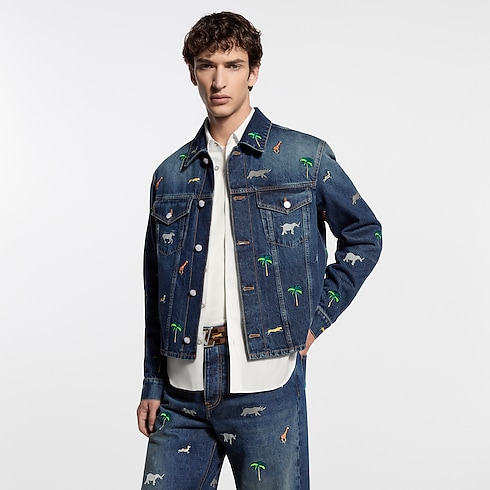 This graphic denim shirt is adorned with the Spring-Summer 2026 show’s LV x The Darjeeling Limited motif, featuring vibrant embroideries of animals and palm trees in a nostalgic ode to travel. This season’s L.V.M. signature adorns a patch pocket on the back, while pearly buttons add a Dandy twist to the trucker-inspired silhouette. Pair with matching pants for a total look.