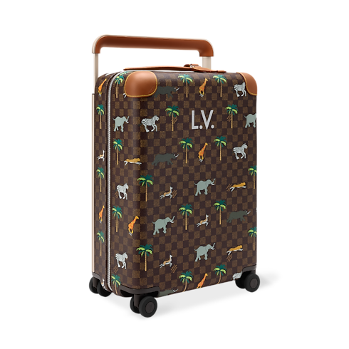 The Horizon 55 rolling suitcase is made from Damier Ebene Heritage canvas, featuring illustrations of wild animals from the savannah as part of the LV x The Darjeeling Limited collection. Brown leather trim on the reinforced corners and cane handle accentuates the darker palette. Its cabin-size format offers an unexpectedly spacious interior.