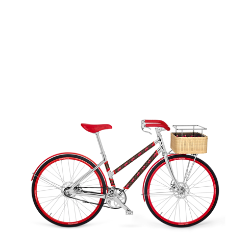 Combining elegance and performance, the LV x TM Bike takes on a colorful, high-spirited look as part of the re-edition of the Louis Vuitton x Takashi Murakami collection. Its rattan front basket, specially created for this limited edition, and V signature frame are lined with Monogram canvas enlivened with bright smiling cherries in the Japanese artist’s playful anime-inspired style. This exceptional bicycle exemplifies the House’s devotion to travel and close links with the art world.