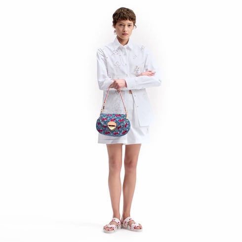 The Sunset handbag projects effortless elegance in a vintage-inspired silhouette, whose chunky, rounded edges are echoed by the oversized golden tuck-lock closure. It is crafted from Monogram denim which is playfully embellished with vibrant cherry embroidery from the second edition of the coveted Louis Vuitton x Murakami collection, while a studded natural leather strap completes the look with an emblematic touch.