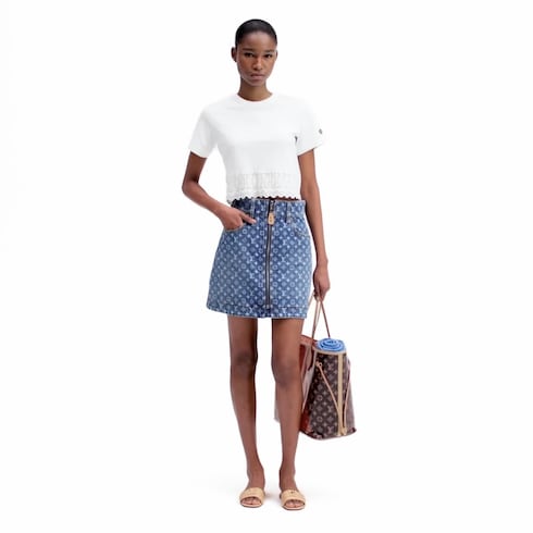 This staple mini skirt is refreshed for the season in graphic Monogram denim detailed with contrasting yellow topstitching. The clean-cut A-line shape is trimmed with a chunky waistband for a flattering silhouette, while an exposed zipper at the front and understated carpenter loops on the back pockets complete the look with a utility feel.