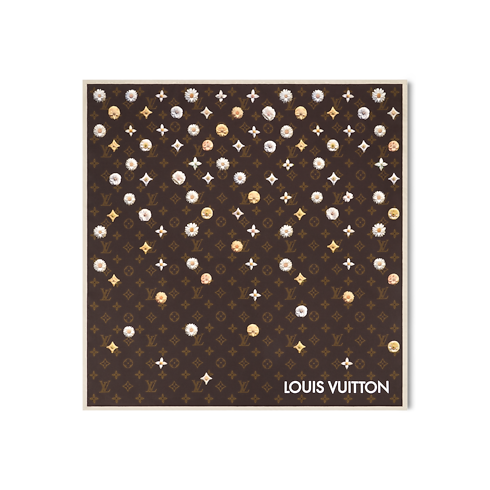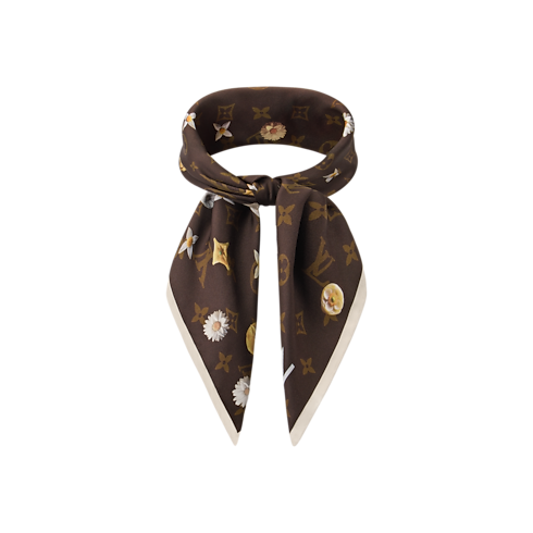 Crafted from 100% pure silk, this Monogram Flower bandana is an elegant accessory that adapts to everyday wear. Made in Italy, it features a transversal print combining Monogram flowers with organic floral motifs. The House's signature color bring depth and warmth to the design.