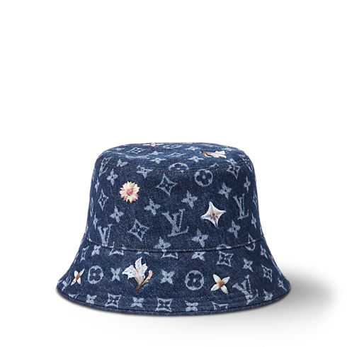 The Monogram Flower denim bucket hat is a contemporary silhouette with refined embellishments. The 100% cotton style is crafted from a timeless denim wash adorned with a Monogram pattern. A handful of flowers is embroidered in white and yellow, balancing the masculine silhouette with a sweet softness.