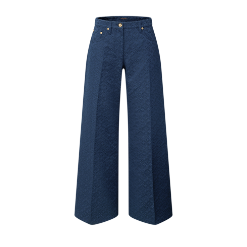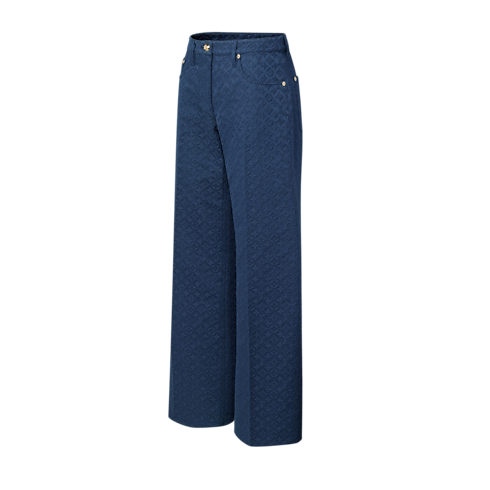 These dressy pants are made from cotton gabardine signed all over with a tone-on-tone Monogram jacquard. They are cut in a clean, flared shape with crisp creases on the front and back of the legs emphasizing the structure. Gold-toned hardware nods to nautical codes, including a domed anchor button on the fastening.