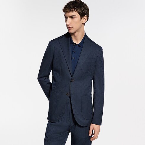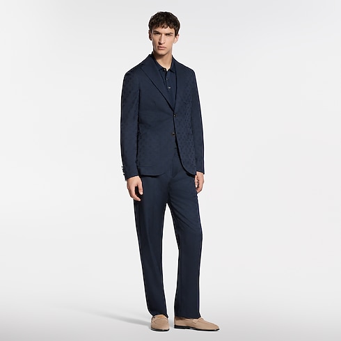 This softly tailored single-breasted Napolitana jacket is light, comfortable and elegant. The timeless navy blue wool fabric is elevated with a tone-on-tone jacquard Monogram motif offering a subtle play of matte and lustrous accents. Matching drawstring pants make a refined set that can be dressed up or down, with a matching shirt or a light knit for an effortless look.