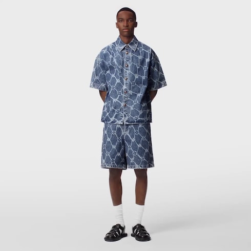 This breezy denim short-sleeved shirt is perfect for leisurely days at sea. The washed indigo cotton is crafted with a bleached-effect Monogram Fishnet print incorporating Monogram Flower details. The motif crosses the body in an irregular fashion, recalling watery distortion. Smart golden dome buttons, reminiscent of sailors' uniforms, complete this casual summery piece, which has matching shorts for a graphic look.