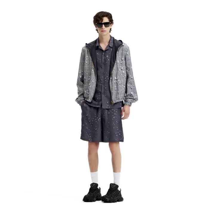 This light, reversible windbreaker offers two distinct looks. One side features a graphic Monogram Waterdrop print, featuring playful Monogram signatures resembling raindrops over an elegant glen plaid. The reverse comes in a timeless dark gray with a discreet tone-on-tone Monogram jacquard. Waterproof and easy to pack, this versatile piece is perfect for a weekend in the country or a rainy day about town.