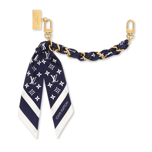 Mixing style with utility, the Monogram Silhouette bag chain expresses the refined marine spirit of the LV Nautical collection. Its elegant braided design combines a gold-toned chain with a silken scarf printed with a nautically inspired variation of the iconic Monogram pattern. With its signature metal plaque, this chic, versatile bag charm transforms into a practical phone strap.