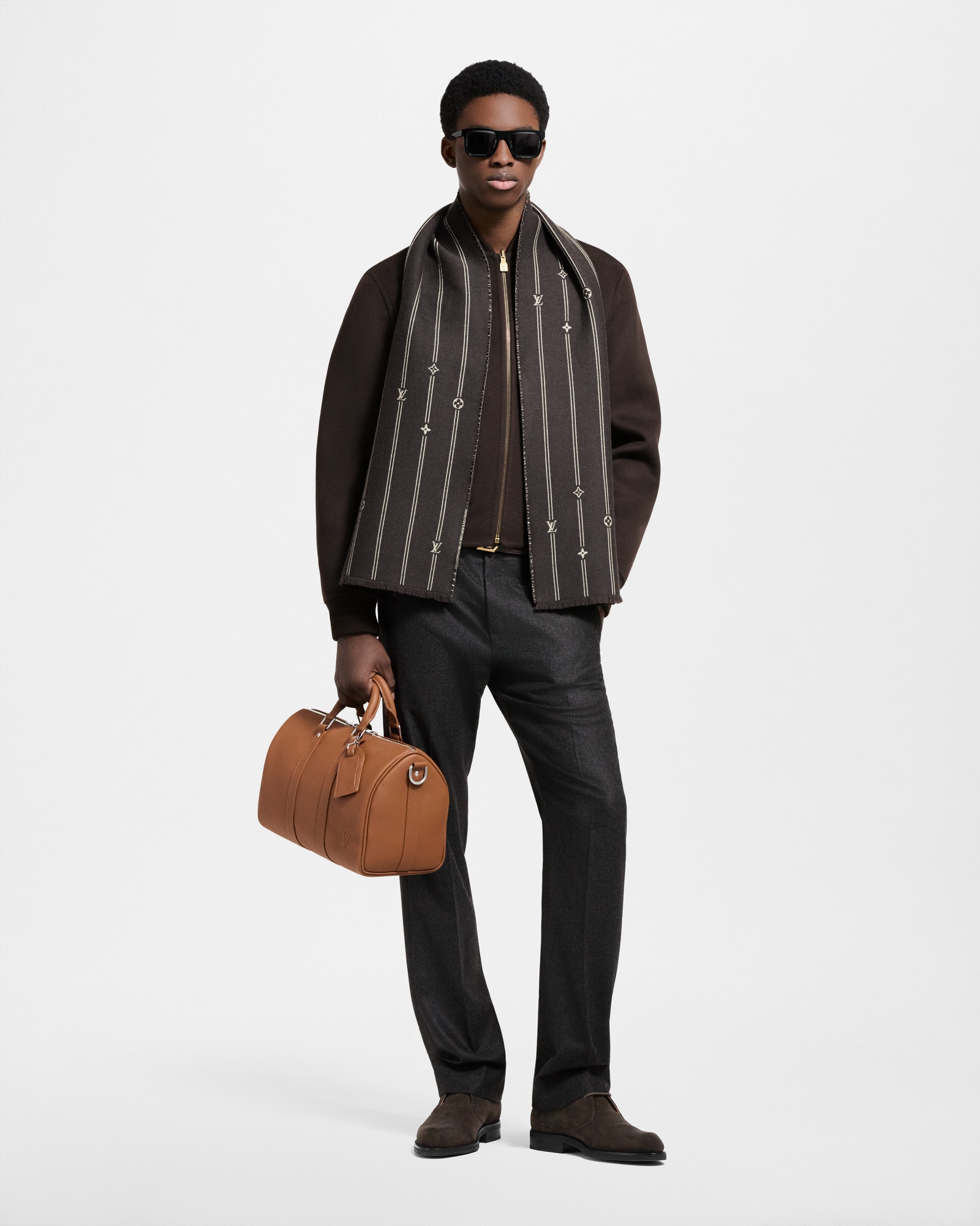 This version of the Italian-made Monogram Stripes scarf achieves its charisma via contrast. The rich, solid background is made only more vibrant when coupled with the dainty signature, rendered in white. Crafted from 100% wool, the style lends instant intensity and warmth, in both comfort and appearance.