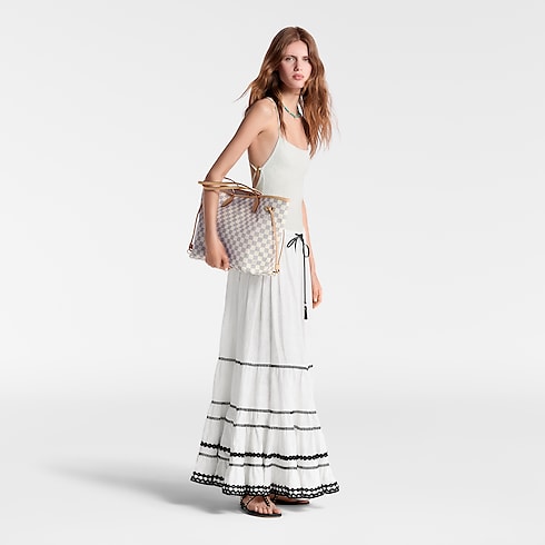 The Neverfull MM tote unites timeless design with heritage details. Made from fresh Damier Azur canvas with natural cowhide trim, it is roomy yet not bulky, with side laces that cinch for a sleek allure or loosen for a casual look. The slim leather handles slip easily over the shoulder or arm. Lined in colorful textile, it features a removable pouch which can be used as a clutch or an extra pocket.