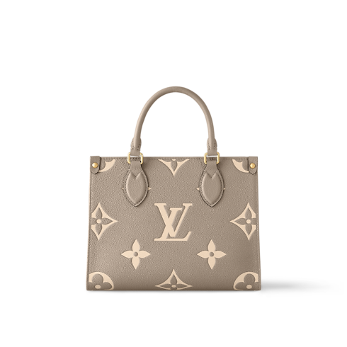 A soft cream-tone makes the Monogram Empreinte leather of this OnTheGo PM bag seem luminous. The LVs and Monogram Flowers embossed into the leather are perfectly complemented by the rectangular lines of this small tote. It can hold smaller essentials like a mini tablet. Two rolled-leather top handles and a detachable strap give carry options.