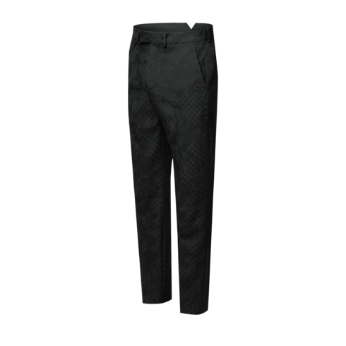 These chic black evening pants are crafted from a luxurious wool jacquard featuring a tone-on-tone Monogram Wildflowers motif with a sumptuous textured finish. Tailored with an elegant Pont Neuf fit, they are signed with an LV-embroidered triangular tab on the right hip and a Marque L.Vuitton Déposée label on the rear waistband. A matching jacket makes a sophisticated suit.