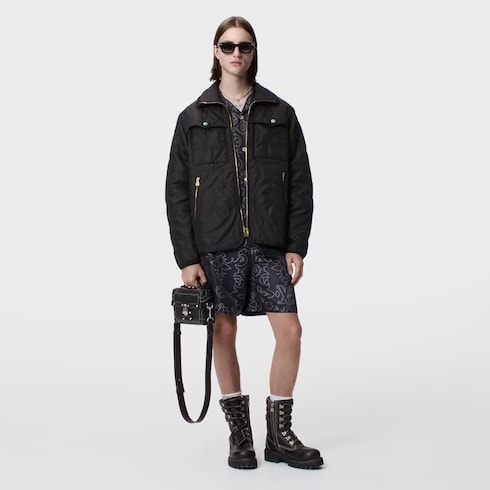 This silk short-sleeved shirt features the FW24 Show’s romantic LV Arabesque motif: a contemporary take on the Monogram inspired by the topstitching on cowboy boots. The graphic white-on-black print creates a playful illusion of real stitching, while the open collar silhouette and relaxed Fit make this a perfect day-to-evening piece, which can be paired with matching shorts.