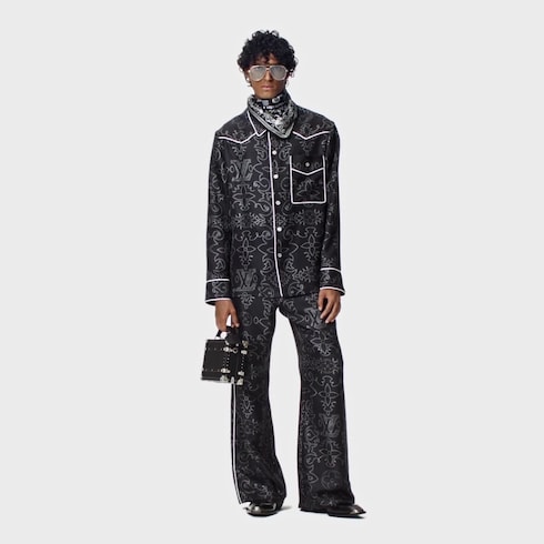 Crafted from silk, these elegant pants feature the FW24 Show’s Western-inspired LV Arabesque motif in a graphic white-on-black print. Contrasting white piping adorns the outside of each leg and the back pocket, while LV-engraved metal drawcord stoppers add a chic finishing touch. A matching shirt makes a fluid evening set.