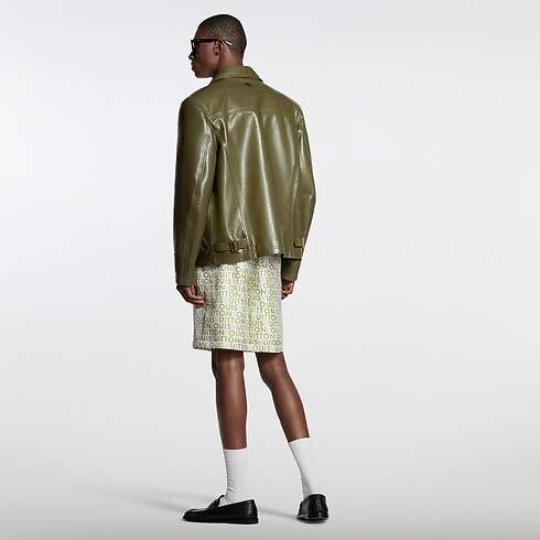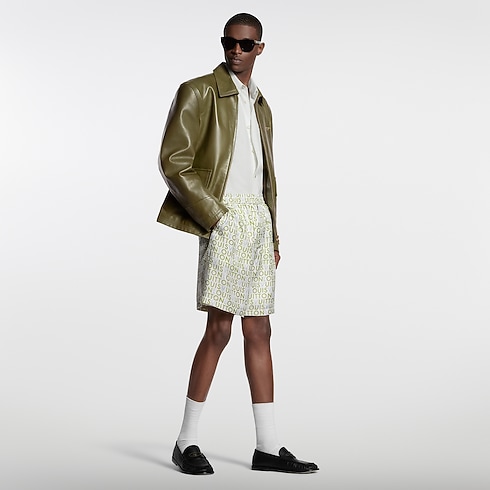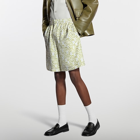 These fluid drawstring shorts, crafted from organic silk, are elevated with a printed LV Maze motif from the Spring-Summer 2026 show. Graphic green and blue Louis Vuitton lettering, inspired by hand-painted billboards from this season’s voyage to India, brings a modern accent to the milky white base. A matching short-sleeved shirt makes a laid-back yet luxurious set.