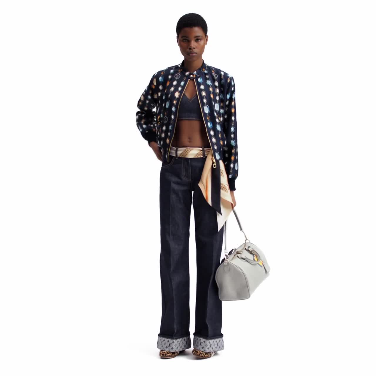 One side of this reversible silk twill bomber jacket makes a refined statement in this season’s signature necklace print, while the reverse is discreetly detailed with a tone-on-tone Monogram motif in a luster finish. Golden hardware highlights the front fastening and pockets, while ribbed hems underscore the sporty style.