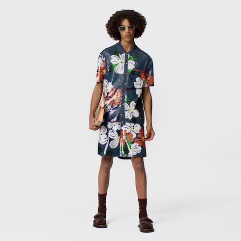 This shimmering shirt lends itself to festive vacation moments. Hand-embroidered allover with sequins, it has a graphic floral motif inspired by this collection's tropical island paradise. Louis Vuitton embroidery on the chest pocket and pearl-effect buttons add further sophistication. Paired with matching shorts, this piece makes a graphic statement look.
