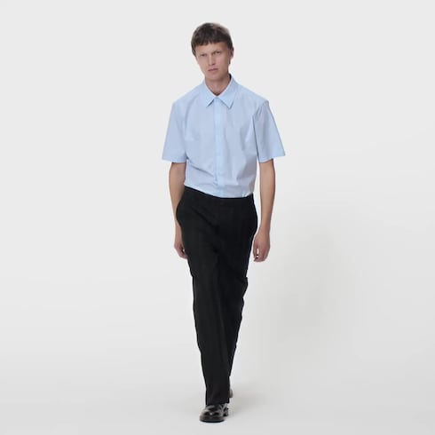 This short-sleeved cotton shirt offers a fresh tailoring option for warmer days. The pale blue cotton is embellished with a delicate Monogram Stripes jacquard incorporating discreet LV signatures and Monogram Flowers. This piece completes the matching softly tailored suit.