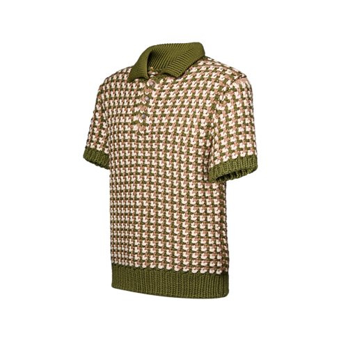 This runway piece from the Spring-Summer 2026 show revisits the classic polo shirt. Crafted in a chunky wool knit, it features a graphic LV Stitch motif in elegant green and beige tones and is finished with a leather signature patch on the back. A layering piece, it can be styled over a shirt for a refined play of color and texture.