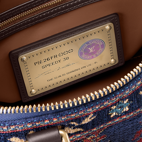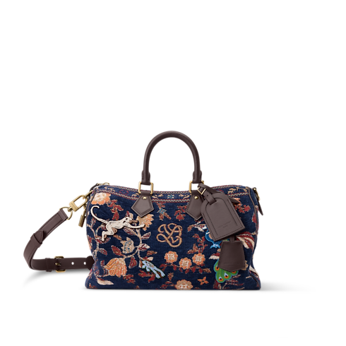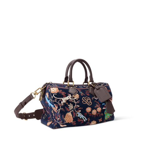 The exceptional Speedy P9 Bandoulière 30 is crafted from jacquard woven with chenille thread into a multicolored warp, creating a tapestry effect. Tufted animals appear embroidered as if moving across the bag. Chocolate-brown leather accents the trim, top handles, and name tag, adding a refined contrast to the vibrant design.